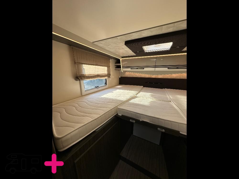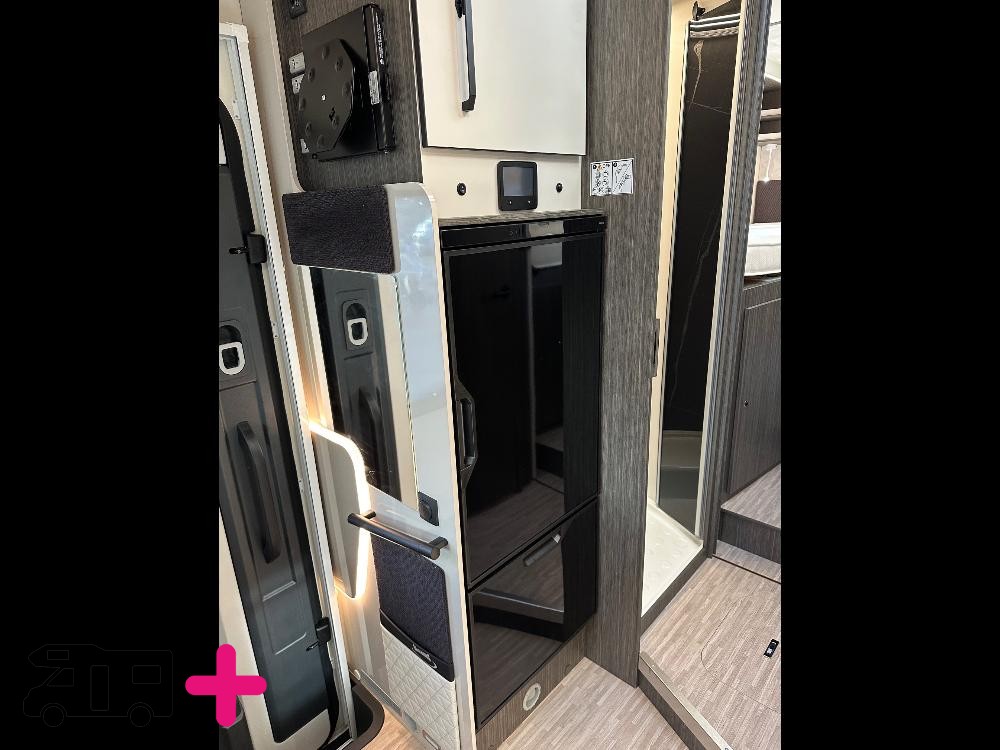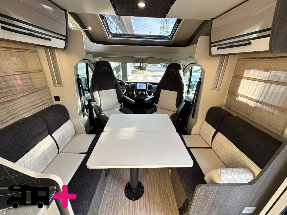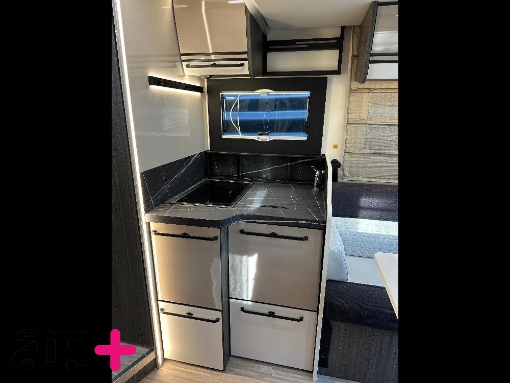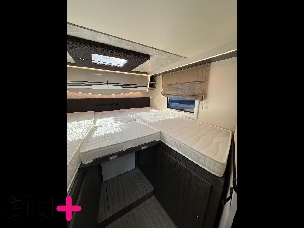 Feux antibrouillard, Pare-chocs avant couleur carrosserie, Skid Plate Noir, Jantes en alliage 16" bicolore, Volant et pommeau de vitesse en cuir, Tableau de bord Techno, TPMS - Contrôle de pression des pneus, Frein à main électrique, Porte cellule XL avec 2 points de sécurité avec fenêtre et serrure centralisée, Panneau solaire 200W avec régulateur MPPT, Skyroof, Stores occultants plissées cabine, Support TV, Housses de sièges cabine